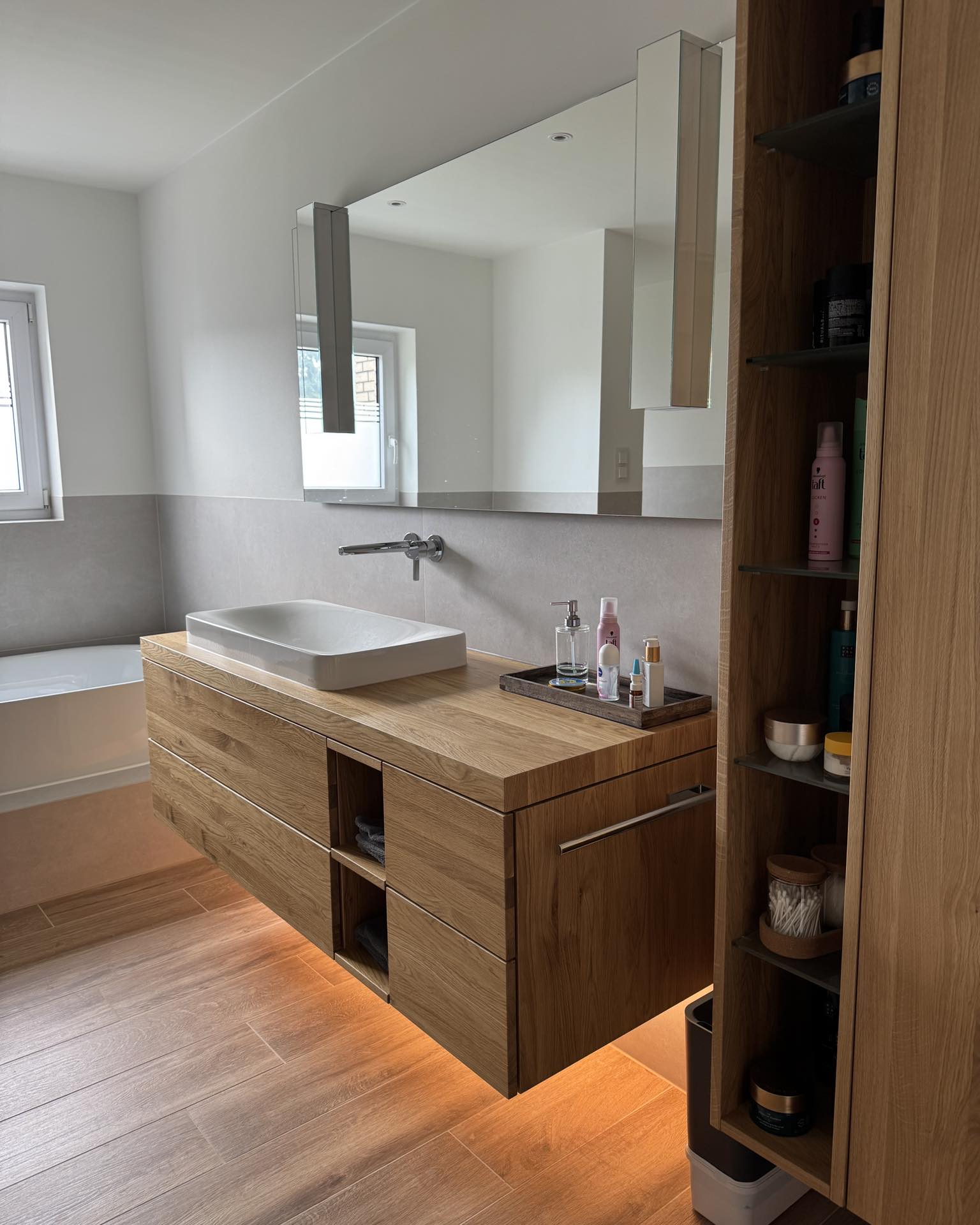 Verwandeln Sie Ihr Badezimmer in eine private Wellness-Oase. Wir fertigen in unserer Schreinerei in Pulheim hochwertige Waschtischmöbel nach Maß, die exakt auf Ihr Waschbecken und Ihre Raumsituation abgestimmt sind.
